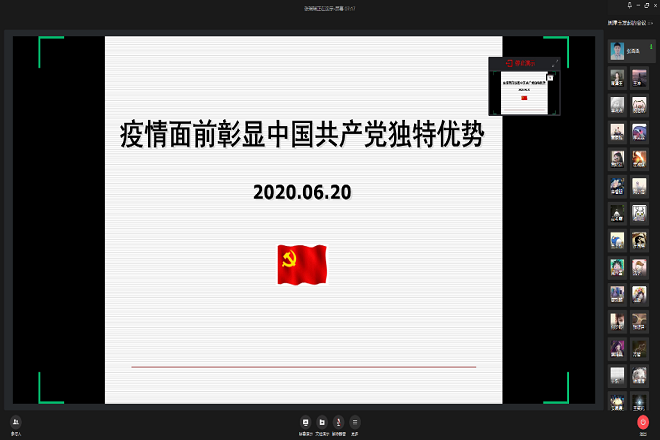 讲座中,张瑶瑶老师以疫情为切入点,将中国全力严防严控之下扭转乾坤的疫情和西方个别国家愈来愈严重的疫情形势两相对比,凸显我国体制优势给防控疫情带来的重要影响。中国人民团结一致坚决打赢抗疫战,从疫情萌生时的迅速应对到防控救治两不误,再到国内一个个省市的“清零”,这一切都离不开中国共产党与生俱来的独特优势。