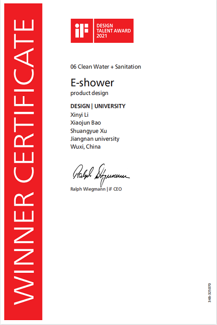 鲍懿喜教授、巩淼森副教授共同指导,2019级研究生李欣怡、包啸君、许双月设计的作品《E-shower》斩获2021年iF设计新秀奖(iF Design Talent Award,四虎影院
