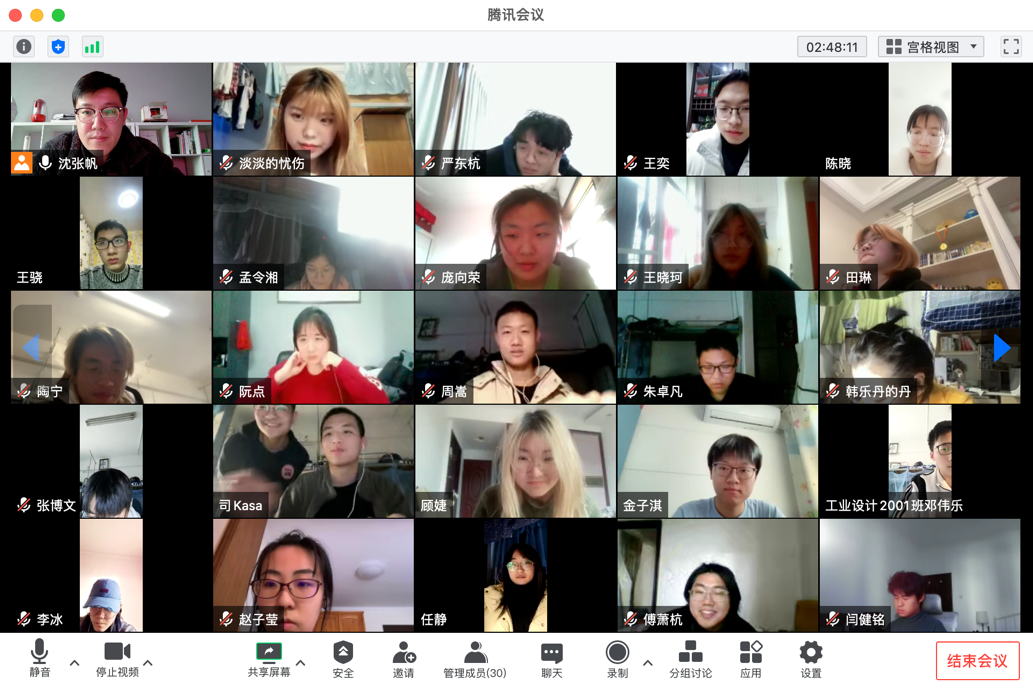 周二下午13:30,工业设计系教师沈张帆发起腾讯会议视频,在新学期为工业设计2001班讲授《产品设计原理与方法》课程第一课,全班30位同学准时上线并开启摄像头。沈老师通过“回形针”这一小而平凡的产品案例将产品设计理念引入课程,同学们通过麦克风、文字积极发言,展现出了浓厚的学习兴趣和学习氛围,课堂教学效果良好。