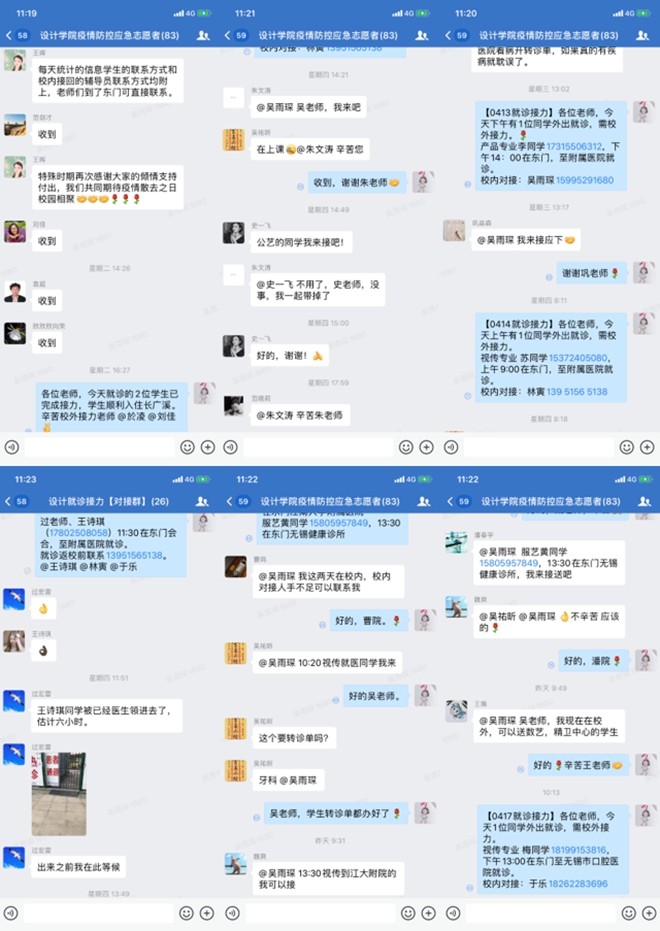 一路之隔的附属医院进行就诊,但学生就诊需求多样化,无锡市内多个就医地点皆有涉及,有的去往中医院进行调理治疗,或是去往健康中心注射狂犬疫苗等。对于这些,学院教师进行有效分工以保证同学们的不同需求,学工办主任吴雨琛暖心照顾每一位学生,合理分配时间,高效安排不同学生前往不同医院,及时在相应地点接送同学们,不仅陪伴在其左右,还对其给予鼓励。马倩如老师最高一天里接力了“七单”,这一天她看到了校园里的凌晨寂静月光,也感受到正午略微炽热的春日暖阳,从医院里的挂号、缴费、拿药,她都亲力亲为,陪同学生在侧,圆满完成一次次出行接力,在教师志愿者这个平凡的岗位上贡献自己的一份力量。