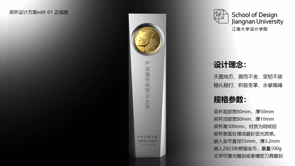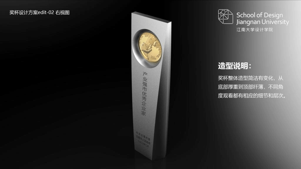 刘颜楷副教授承担了本次大会“产业强市优秀企业家”荣誉奖杯的设计工作,以“纪念碑和丰碑为原型,融入江南中式之意境,体现科技感和现代感”的设计理念,通过简洁而富有变化的立体造型和细节层次感,表现无锡优秀企业家“尚德务实、坚忍不拔、锲而不舍、稳扎稳打、积极变革、勇攀高峰”的优秀品格。整个过程从创意、设计、定稿、制作到成品,都体现了四虎影院