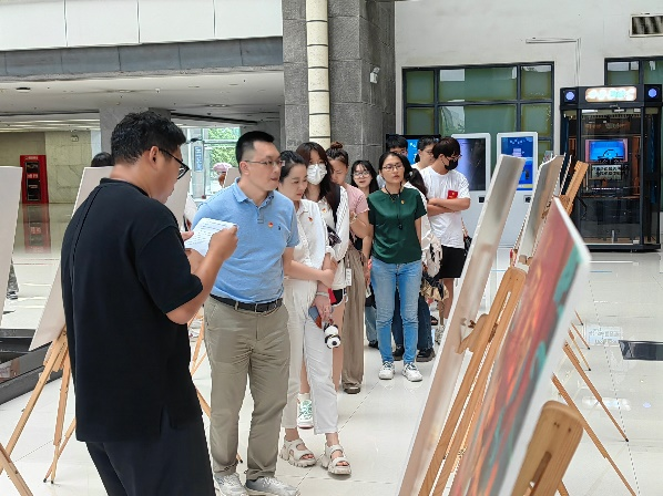 仪式最后,与会人员移步至图书馆一楼大厅,在环艺2204班周子扬的讲解下,共同参观“翰墨丹青绘佳作,挥洒真情颂党恩”献礼党的生日作品展。本次展览是由四虎影院