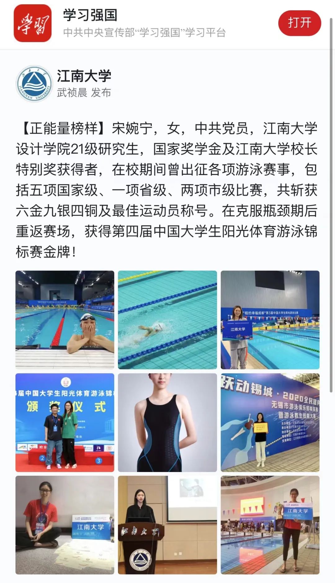 校长特别奖获得者,在校期间曾出征各项游泳赛事,包括五项国家级、一项省级、两项市级比赛,共斩获六金九银四铜及最佳运动员称号。在克服严重瓶颈期和低谷期后重返赛场,斩获第四届中国大学生阳光体育游泳锦标赛金牌。