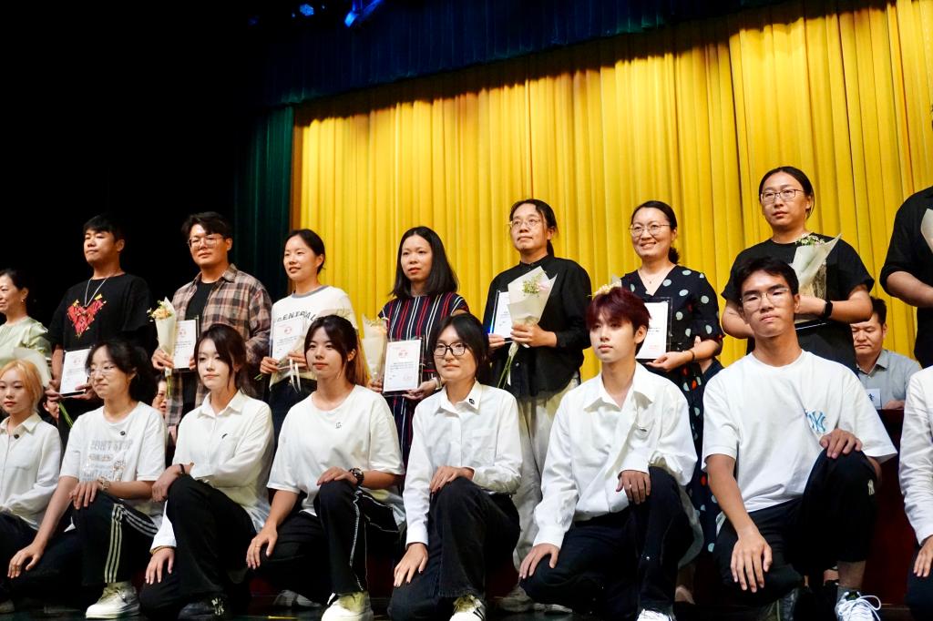 随后举行新生班主任聘任仪式。学院领导为新生班主任颁发聘书,学生代表为新生班主任献花,新生班主任为学生佩戴院徽。仪式不仅体现了学院对班主任工作的高度重视,也体现了青山设计薪火相传的理念。今年开学典礼加入了班风班貌展示环节。23个本科班级代表依次上台发言,带领班级成员喊响各自班级的口号。台下每个班级自己设计的班旗挥舞,与台上遥相呼应。班级班貌展示意在推动班级文化建设,增强新生的班级荣誉感和专业认同感。
