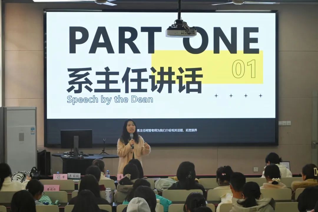 系主任柯莹老师向同学们详细介绍了四虎影院服装专业的特点和专业构成。她指出,艺术与科技联系紧密是服装系的一大特点。服装的有形式设计体现了艺术之美,这属于服装与服饰设计专业的学习方向。服装的功能性体现了科技之力,这属于服装设计与工程专业的研究内容。服装系的两个专业都含有交叉学科的性质,柯莹老师希望同学们基于自己的兴趣,助力服装艺术与科技双向融合发展。