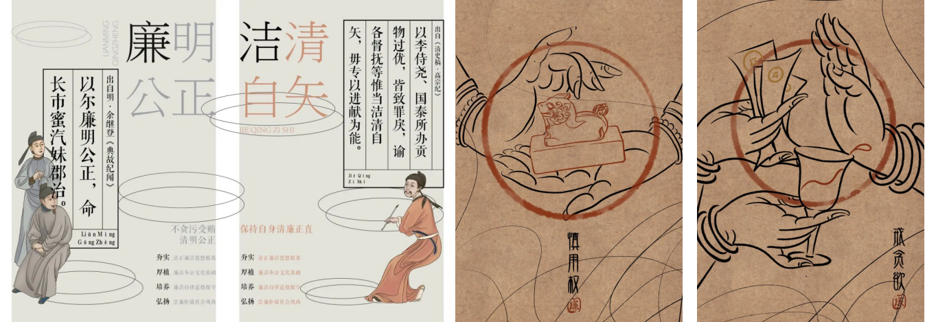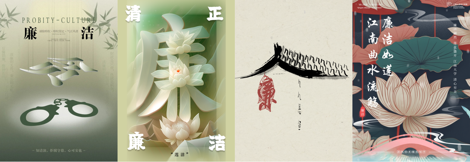 同学们通过挖掘校园文化、历史文献、传统经典、文物古迹等蕴含的廉洁元素,提炼出了廉洁文化的思想内涵、时代价值和教化功能,从而创作了丰富的海报、公益广告、文创设计等平面创意作品。