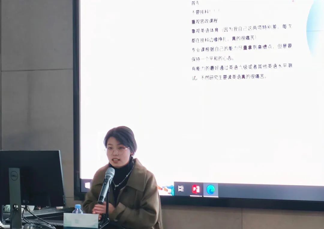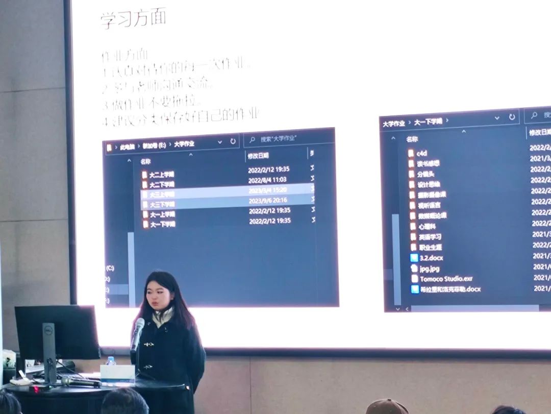 王彩瑜同学首先从课程绩点和综测比赛加分两个方面讲解了推免的加分规则并针对性地提出了多个注意点,如需要重点关注的学科,选择比赛的考量标准等。对于专业比赛,王彩瑜学姐特别强调了选择参赛课题的重要性,因为参赛的项目在专业展现方面是有限的,前期选择好一个恰当的课题将对获奖起至关重要的作用。苏俊芊同学将分享分为学习和生活两方面,建议同学们在紧抓学习的同时也要丰富生活。在学习方面,要多于老师交流,多向老师提问。数字媒体艺术专业的科目有很多高质量的作业任务,同学们要认真对待每一次的作业并在完成后分类保存,以备将来使用。在生活方面,苏俊芊学姐建议同学们在学习之余积极加入社团并注重体育锻炼,关注体育成绩。