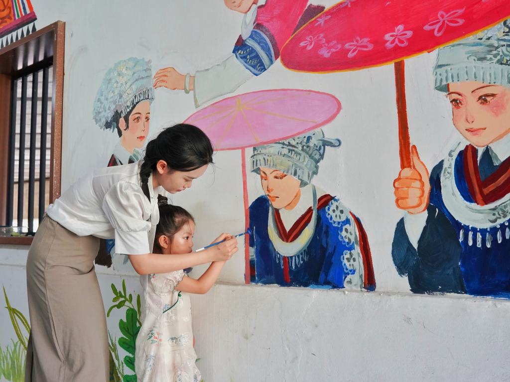 墙绘过程也吸引了许多当地居民和小朋友们的驻足观赏,实践团成员亲切地邀请他们加入绘制并给予耐心指导。“哇,苗族姑娘的银饰真好看呐!”“我们中华民族的文化真是丰富多彩!”“太厉害了,让我们家小娃长大了也学画画,去帮助更多的人”……居民们脸上的笑容和你一言我一语的评价,是对实践团成员最大的肯定和最好的鼓励。邀请社区儿童一起绘画更是响应儿童友好城市建设号召,回归尊重“儿童高度”“儿童权利”“儿童天性”的人本“儿童视角”。尊重儿童认知空间的视角、认识能力和创造力,创造一个保障街道串联性、尺度适宜性、可以激发儿童游戏天性的街道空间场所。儿童以更为独立、自由、平等的身份参与儿童友好街道空间的研究和营建,使“对儿童的研究”变“有儿童的研究”,维护街道作为儿童生活场所的身份,重启街道作为公共生活空间的社会活力感与融洽感。