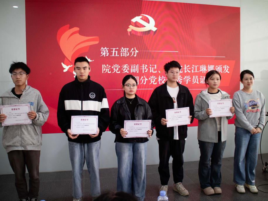 为表彰先进、树立典型,学院党委综合考量平时表现和结业成绩,在第47期发展对象培训班的49人中评选出了5名优秀学员。江琳娜为他们颁发优秀学员证书并寄语,希望他们再接再厉,争当所有党员和正在努力成为党员同学的表率,让青春为中国式现代化挺膺担当,争做担当民族大任的时代新人。