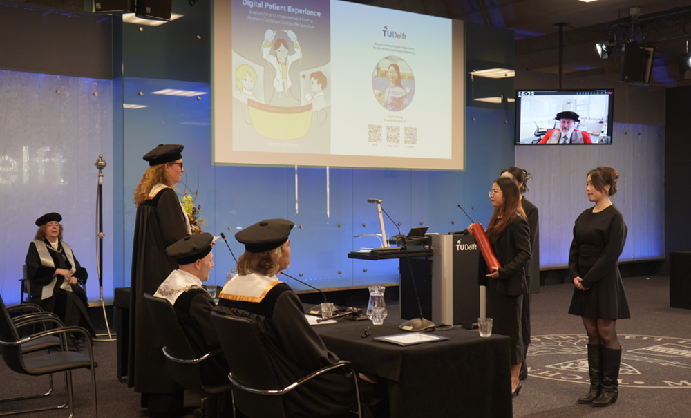 与代尔夫特理工大学联合培养的博士王婷婷的博士论文答辩,与英国剑桥大学的John Clarkson教授、荷兰代尔夫特理工大学Daan Eijk教授、Peter Desmet教授等健康医疗领域的专家学者共同作为答辩委员参加答辩,结合博士课题开展讨论和学术问答,并最终审议确定授予博士学位。答辩过程参照荷兰的学术传统,严肃庄重又富有仪式感。