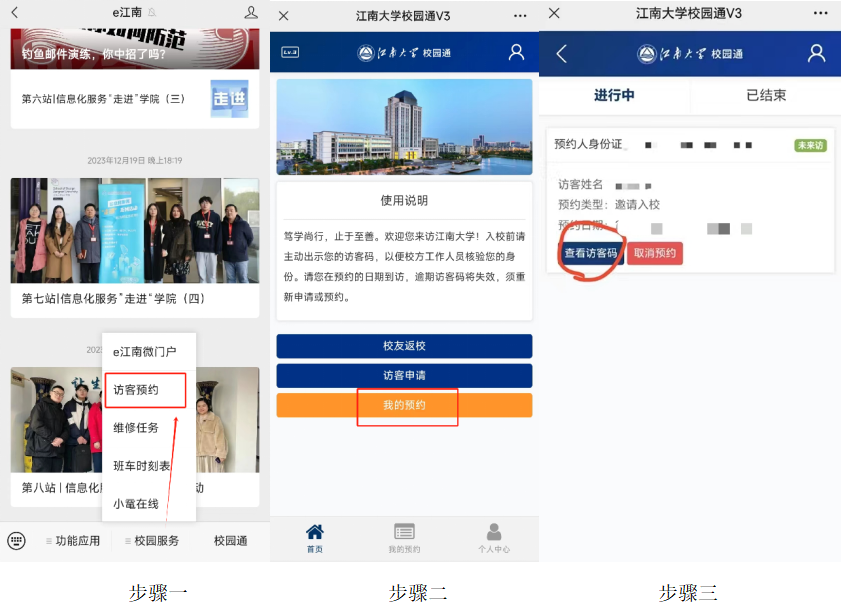 考生采用“访客预约”入校,考生请按照以下步骤进行操作:
