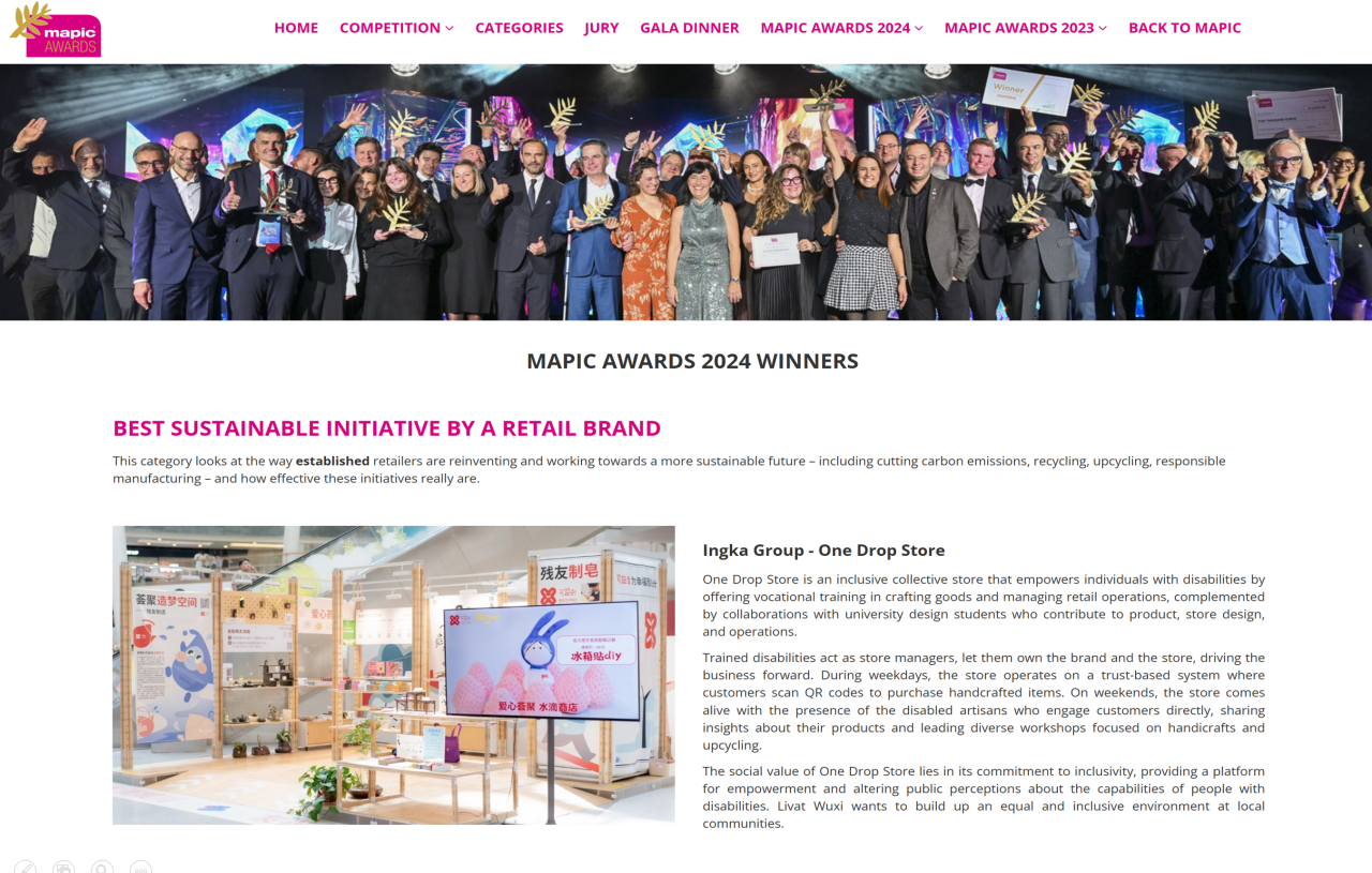 DESIS lab与无锡荟聚、无锡市可益会公益设计实验室三方合作完成的社会创新项目---水滴商店(One Drop Store)最终胜出,荣获零售品牌最佳可持续项目类别的最终大奖。