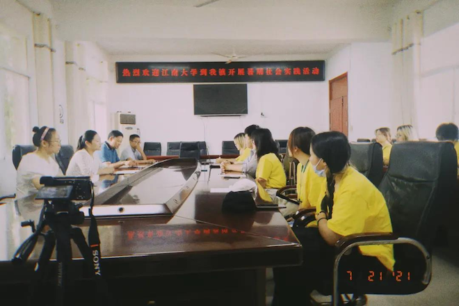 “艺”心向党•乡“约”振兴暑期社会实践团队到达实践地点——安徽省霍邱县河口镇。7月21号上午,团队与本次实践活动校外指导老师、安徽省六安市霍邱县河口镇党委书记王祥磊在河口镇人民政府举行了首次党史学习教育交流座谈会。会议上,队长朱荟雯介绍本次实践活动的目的和具体实践内容,对镇领导班子的积极支持和配合表示诚挚感谢。同时王书记介绍了河口镇的基本情况,对团队的实践内容安排和行程管理提出合理有效的建议。双方就建党百年的大背景下党建创新引领基层治理方面展开积极交流,共话基层党建引领新模式。