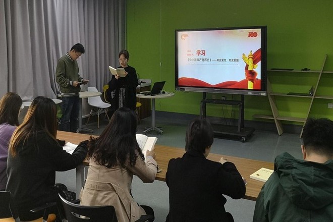 党日活动伊始,创业党支部和交互党支部的师生党员通过集体观影、座谈等多种形式进行了自学,各支部指导教师结合各支部实际情况进行了工作指导。组织生活会上,师生党员集体学习了习近平总书记致厦门大学建校100周年的贺信,创业党支部学生党员王之川进行了领学;交互党支部学生党员朱乐其领学了习近平《论中国共产党历史》的部分内容。