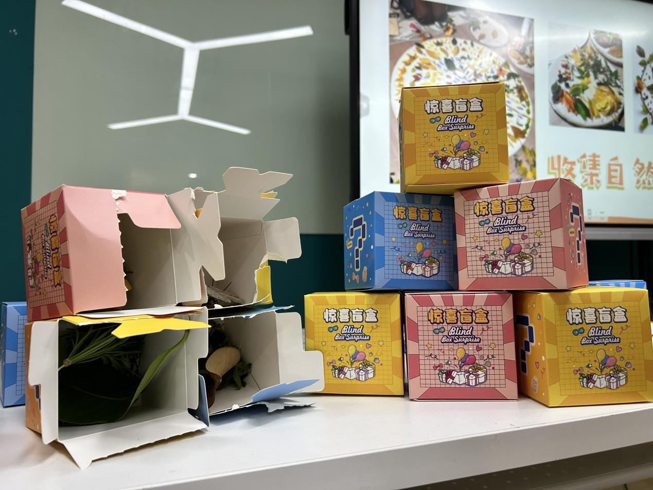 触觉盲盒,唤起记忆的味道回到活动室内,迎来第二个环节——“自然盲盒·感官挑战”。每人随机抽取一个自然物盲盒,闭上眼,仅靠触觉与嗅觉感知盒中之物。有人摸到一片卷边的树叶、有人闻到花瓣中隐约的甜香。分享环节中,大家将自己的联想、感受轻声诉说,一场与自然、与记忆的连接,在不经意中悄然发生。