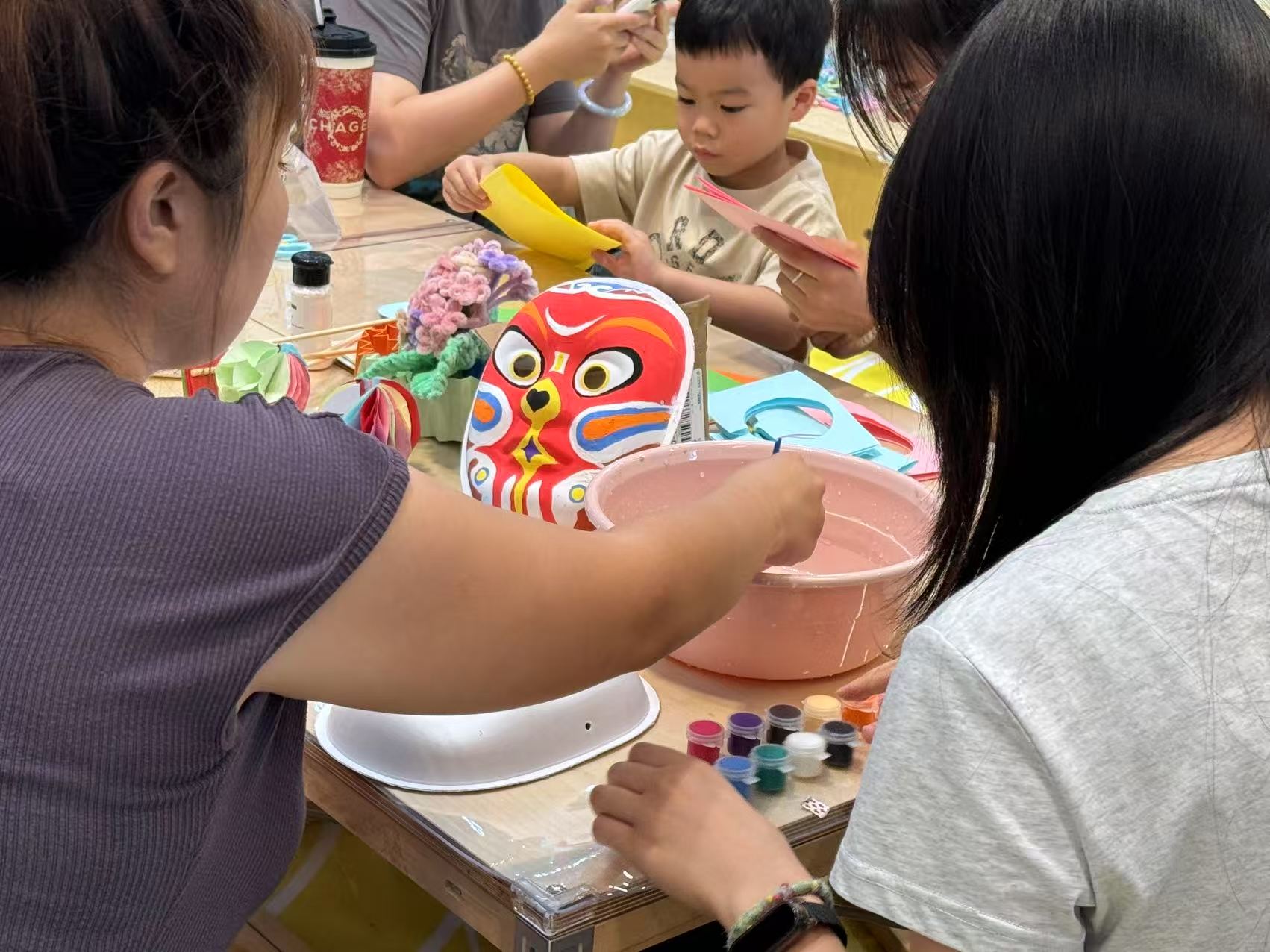 非遗主题活动现场氛围热烈而温馨,活动开业就吸引了商场游客参观,小朋友们积极投入课程学习。 在绒花扭扭棒制作体验区,大家利用色彩缤纷的扭扭棒,在老师和残友搭档的耐心指导下,学习基础的制作技法,体验将柔软材料幻化为精致艺术品的奇妙过程。