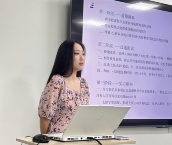 紧接着由工业设计专业殷欣雨学姐开展自身经验分享,殷学姐从前期准备、投递面试、实习期间三个阶段分别展开叙述。在前期准备中,学姐建议将学校课程作业重新排版整理成作品集,在校经历梳理成清晰简洁的简历,同时准备1分钟以内的自我介绍和提前整理可能会问到的问题。在投递面试中,投递渠道方面,官网>BOSS直聘>小红书>豆瓣=智联=猎鸭。制作投递表格,将已经授递的岗位整理成表格,定时查看进度。面试注意记录+复盘,在一次次面试中把漏洞填补上。和HR沟通任期时间一律3-6个月,甚至6个月以上。在实习期间,尽可能的多拿项目为后面秋招作品集做准备,同事注意去除学生思维,职场上要主动争取机会,竞争太激烈,机会很少很重要,搞好人际关系(同时减少内耗)。最后殷学姐展示了部分自己的作品集,让同学们对作品集制作方面更加了解。