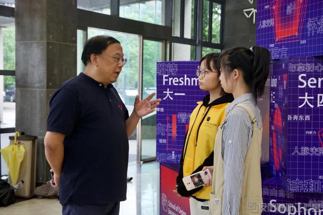 党委书记邱建平、院长魏洁、党委副书记王晖深入现场指导工作并与学生进行交流,他们对学院迎新文创产品给予了高度肯定,并对新生们进行了亲切的问候和鼓励。