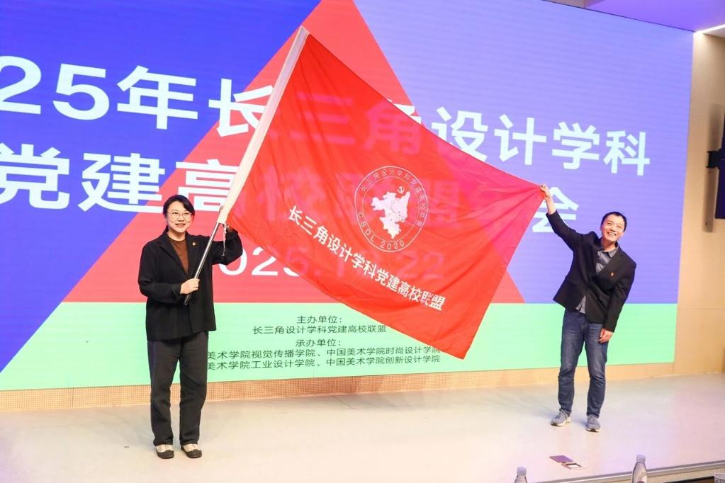党委书记刘征(右)上台交接会旗仪式、同济大学设计创意学院党委副书记张雪青(左)担任下届主办方