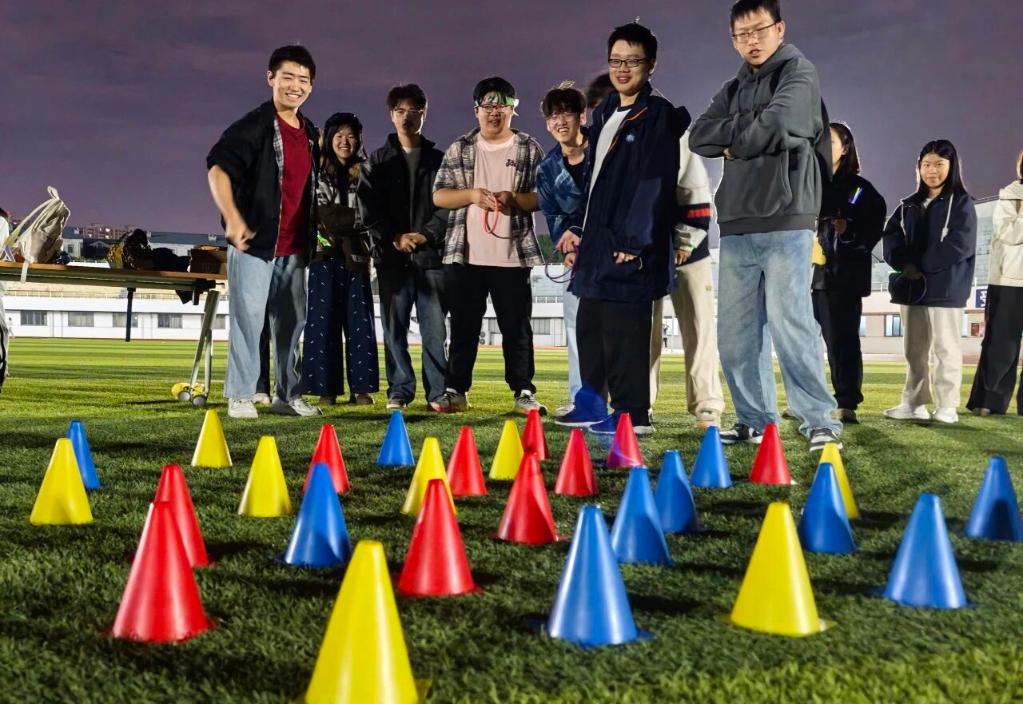 除了跑步环节,活动现场还设置了独具特色的三级游戏区域。“毽子围踢”考验团队配合,“荧光圈套”展现精准技巧,“动作传声筒”则充满了欢声笑语。同学们自由组队,凭借跑步获得的手环参与游戏,在运动中感受设计的趣味,在游戏中体会团队的力量。活动最后,同学们用游戏获得的积分兑换了精美奖品。2025级产品设计专业的李同学展示着手中的奖品说:“这不仅是一份奖励,更是对自己今晚努力运动的见证。原来运动可以这么有趣!”