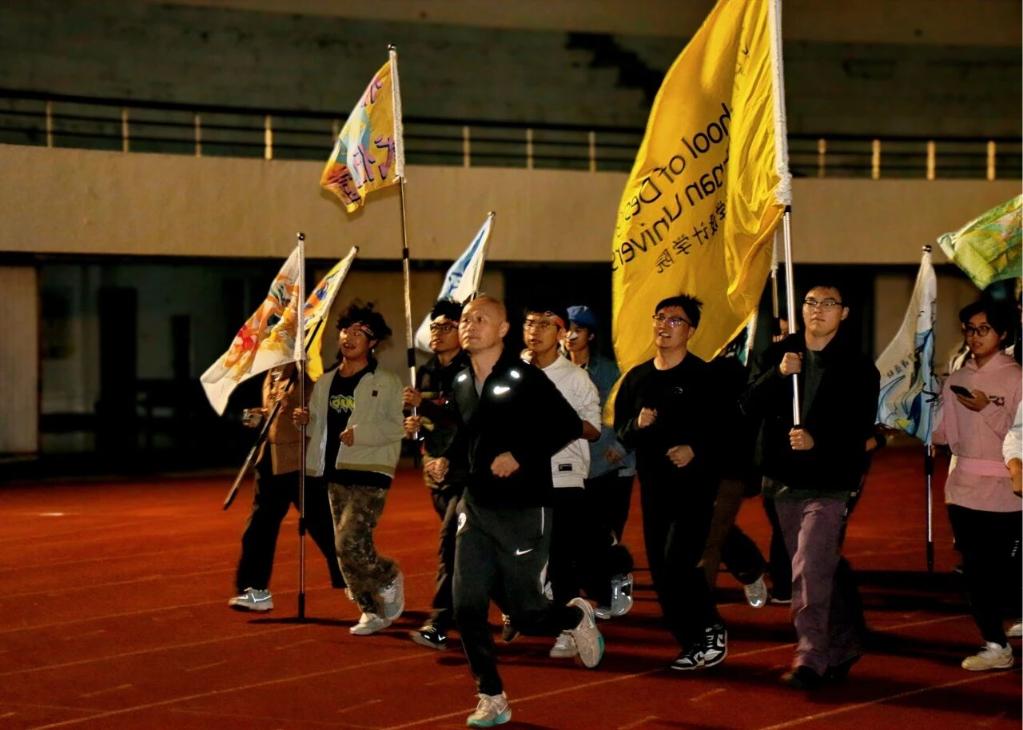 随着发令声响,周林副院长与辅导员曹淑慧、张楠老师一同站在了跑道最前方,带领着四个专业的新生们开始了今晚的奔跑。产品设计的蓝色抹额、环境艺术的绿色、视觉传达的橙色、公共艺术的紫色,在夜色中交织成一道流动的彩虹。
