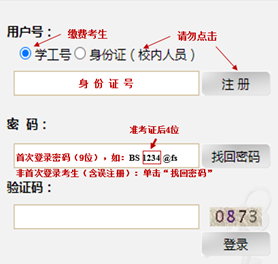 网上缴费平台”,完成缴费。考生账号已开通,切勿自行注册。收费标准:80元/生(仅申请考核考生,硕博连读考生无须缴费)。用户号在“学工号”输入正确的身份证号,初始密码(9位):“BS”+准考证编号后4位+“@fs”(准考证查看网址://yzgmis.sihuyy.org/zsgl/bswb/login.aspx),如“BS1234@fs”。非首次登录缴费系统的考生(含往年报考考生及误注册考生)请使用“找回密码”,登录并缴费。