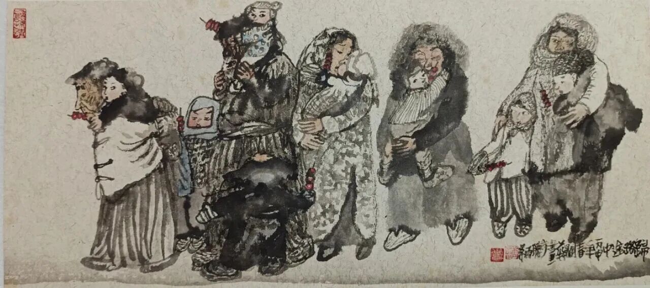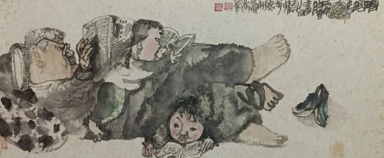他的国画作品在人物造型方面采用夸张变形的手法,笨拙的线条,使作品更具个性和艺术韵味,凸显儿童天真、朴实、随性的情怀。在画面处理方面,用水墨建构,巧妙地利用墨的干湿,水的晕染变化,令画面达到一种虚实变化多端,若隐若现的浑厚虚幻境界,既有黄宾虹和李可染的艺术风采,又充满了时代感。