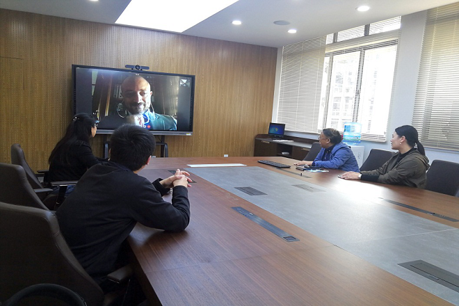 魏洁代表学院对GabrieleGoretti副教授疫情期间克服困难坚持在线教学表示积极肯定,并以自身在线教学的经验和GabrieleGoretti分享和探讨了在线教学过程中的困难和解决方案。邱建平代表学院传达了对GabrieleGoretti的慰问,并向他传达了学校正式开学后的相关教学和工作安排等,正值五·一假期来临之际,向GabrieleGoretti表达关心和问候。曹鸣从教学和国际合作的角度,同GabrieleGoretti副教授在时差、在线教学授课方式等遇到的问题和困难进行了沟通,并表达了关切,关照他保证身体,平安度过疫情。GabrieleGoretti非常感谢学院的关心和关切,表示自己虽然人在意大利,目前疫情形势已经趋缓,自己也做好了必要的防护,请学院领导放心;他同时表示疫情并不能阻隔工作和教学的热情,自己也在尽最大可能完成相关教学和研究任务,并希望能够早日返校。