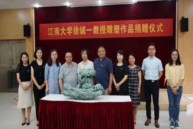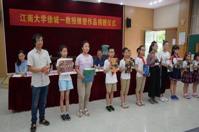 捐赠仪式上,徐诚一教授向云林实验小学捐赠雕塑作品一件及个人著作10余本。其中捐赠的雕塑作品《希望》是徐教授参加全国第九届美术展览获银奖的作品(金奖空缺),也是徐老师第101件作品的捐赠。作品以生动简约的现代雕塑艺术语言和创作手法,塑造了一名山村女童在洪水中,一手紧扶浮木,一手紧抓头顶书包,呼喊求救的感人情景,以此来表现她求生求学的迫切希望,从中生动反映出一个民族未来的希望。为了表达对徐教授的感谢,云小书画社的学生们也向徐教授回赠了自己的作品,将这份沉甸甸的“希望”延续。