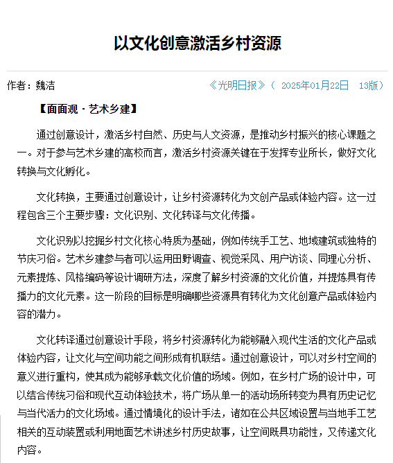 【光明日报1月22日】通过创意设计,激活乡村自然、历史与人文资源,是推动乡村振兴的核心课题之一。对于参与艺术乡建的高校而言,激活乡村资源关键在于发挥专业所长,做好文化转换与文化孵化。文化转换,主要通过创意设计,让乡村资源转化为文创产品或体验内容。这一过程包含三个主要步骤:文化识别、文化转译与文化传播。[…]