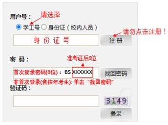 财务处”,在“业务办理”中选“学生缴费”。考生账号已开通,切勿自行注册。复试收费标准:80元/生(仅申请考核考生,硕博连读考生无须缴费)。用户号选择“学工号”,输入正确的身份证号。缴费系统初始密码(8位)为大写字母“BS”加准考证编号后6位(准考证查看网址://yzgmis.sihuyy.org/zsgl/bswb/login.aspx),如“BS123456”。非首次登录缴费系统的考生(含往年报考考生及误注册考生)使用“找回密码”,登录并缴费。