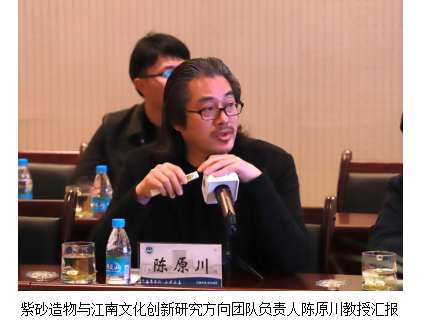紫砂造物与江南文化创新研究方向负责人陈原川教授结合团队建设和研究目标、主要研究内容、人才培养目标和措施、学术研究计划、取得的阶段性成果和为研究院发展所作的具体工作等内容进行了汇报。
