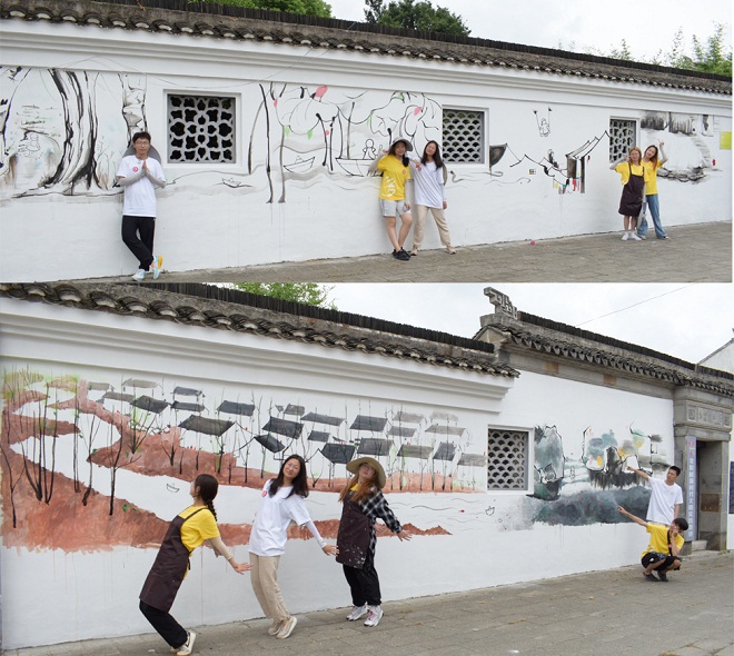 7月21日起至7月28日,“绘史传德”实践团队在吴冠中故居前开展了线下墙绘活动。实践期间历经台风“烟花”来袭,一天经历反复切换的“晴、阴、雨”多变天气,团队成员们一起克服烈日曝晒、蚊虫叮咬、交通不便等困难,用心绘制每一面墙,绘制总面积达223.1平方米。经过为期一周的实践,以铅笔在白墙勾勒轮廓开始,经过弹线、上色、塑造和题字等工序后,原本斑驳、陈旧的墙面被团队成员们成功改造,一组组简江南画作在光秃的墙壁上浮现,仿佛有了新的生命。实践团队的墙绘成果更是吸引了不少村民的驻足观看,甚至有在周边居住的青年,主动报名自愿加入实践活动。
