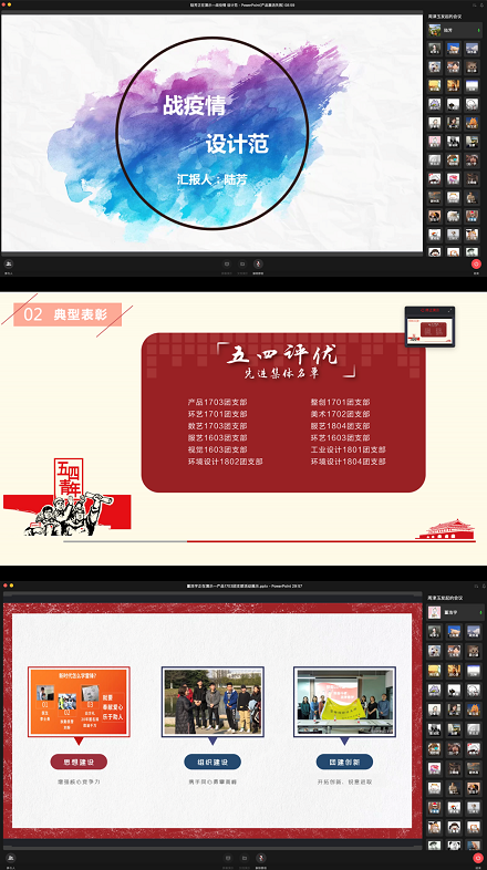 本次活动分为“战疫纪实-典型表彰-榜样启发-师导生思”四个环节。首先,与会人员集体观看了清华大学武汉籍学生张睿茹英文演讲视频《疫情期间,我看到爱的光辉》,从亲历者讲述武汉故事、中国故事视角感受全国人民对抗新冠时的团结一致、万众一心。学院分团委书记陆芳从组织学生开展战疫云演讲、创作战疫作品、志愿服务他人等方面总结了学院青年学子在疫情期间发挥专业特色,通过线上线下联动,以艺抗疫,用实际行动展现设院学子的战疫担当与风采。