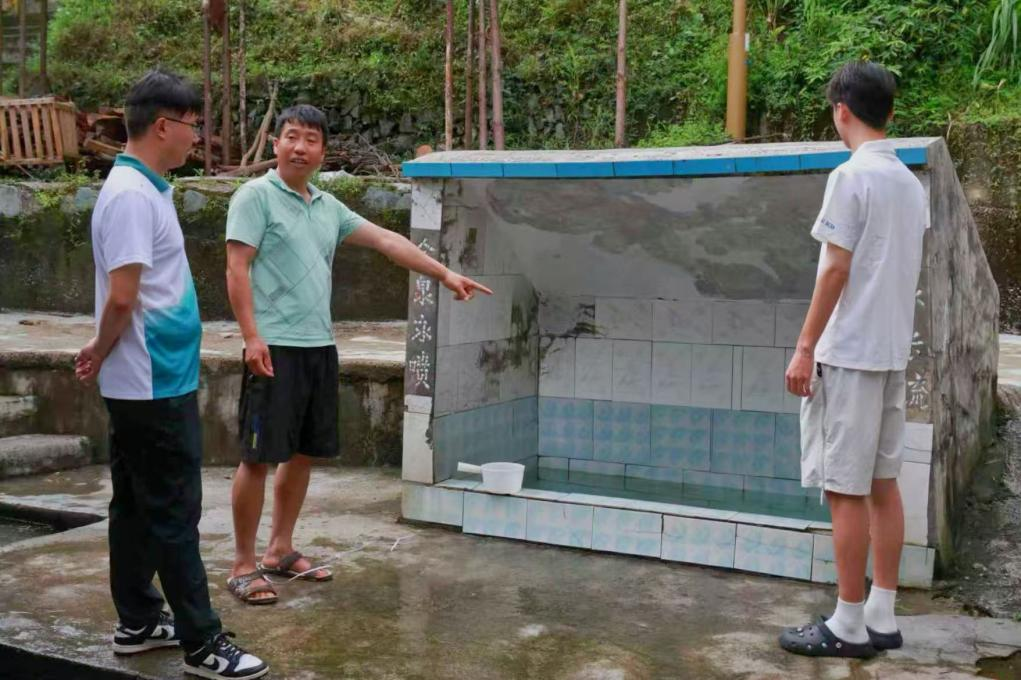 沿着石阶往上走,两侧是郁郁葱葱的灌木丛,虫鸣声此起彼伏。入眼便是蓄满山泉的池子,走近看可以发现有一眼泉水正从地下向上涌,泛起一圈圈细密的涟漪。负责人弯腰掬起一捧水,清冽的泉水顺着指缝滴落,在青石板上砸出细碎的水花,带着山间草木的清芬。“咱这黄精酒的秘诀就在这水里,这可是从石缝里渗出来的山泉水,矿物质含量很高的,酿出的酒才格外醇厚。”