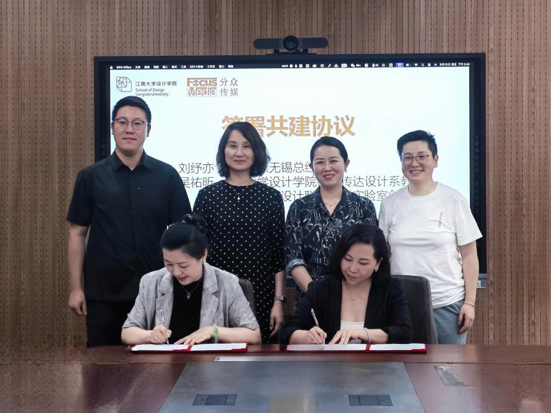 社会科学处副处长沈张帆共同揭牌,标志着双方在新消费场景创新领域的合作正式启动。随后,分众传媒无锡总经理刘纾亦与吴祐昕教授签署了共建协议,明确了双方在资源整合、项目孵化、技术研发等方面的合作框架。