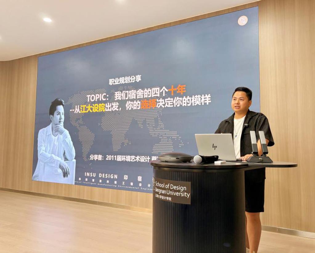 蔡刚以“从江大设院出发,你的选择决定你的模样”为主题,通过宿舍四名同学毕业十年后的不同发展路径,生动阐释了职业选择的多样性和可能性。他首先分享了宿舍四人的发展故事,特别强调大学是“低成本试错”的黄金时期,为同学们提出三大建议:第一是“走出去”——通过社团、比赛、讲座、兼职、校园创业等方式创造了解自己的机会,进行低成本试错,探索自我;第二是“聚焦”——死磕一项硬核技能,如AI技术、商业策划能力、英语、视频剪辑等,提前打造不可替代的核心竞争力;第三是“放大”——打造个人自媒体IP,通过坚持输入输出,建立个人品牌,被动吸引机会。最后,他表示设计行业正朝着“专业细分化、设计延展化、技术效率化”发展,提醒同学们不仅要夯实手上功夫、嘴上功夫、案头功夫以及框外功夫,还要善用AI等新工具提升竞争力。“AI不是来取代设计师的,而是来取代不会用AI的设计师。”他以此激励大家保持学习、主动求变。