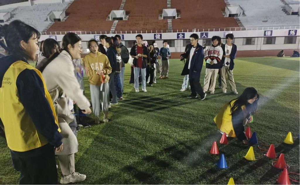 除了跑步环节,活动现场还设置了独具特色的三级游戏区域。“毽子围踢”考验团队配合,“荧光圈套”展现精准技巧,“动作传声筒”则充满了欢声笑语。同学们自由组队,凭借跑步获得的手环参与游戏,在运动中感受设计的趣味,在游戏中体会团队的力量。活动最后,同学们用游戏获得的积分兑换了精美奖品。2025级产品设计专业的李同学展示着手中的奖品说:“这不仅是一份奖励,更是对自己今晚努力运动的见证。原来运动可以这么有趣!”