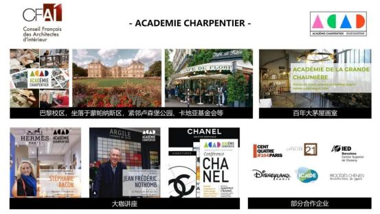 巴黎夏庞蒂埃学院(Académie Charpentier)是一所由法国百年艺术世家Charpentier夏庞蒂埃家族创办的的高等艺术院校,提供五年制本硕连读课程,颁发中法两国教育部认证的硕士文凭,也是少数受法国室内建筑师委员会(CFAI)认证的院校之一。学院创立于1945年,位于巴黎6区,紧邻著名的艺术与高等学府区——蒙帕纳斯区,坐拥巴黎众多艺术场馆及文教中心资源。自有距今百年的大茅屋画室(Académie de la Grande Chaumière),见证了毕加索、马克·夏加尔、欧仁·格拉塞、阿梅代奥·莫迪利亚尼、常玉、潘玉良、吴冠中、朱德群、赵无极等艺术巨匠的诞生。
