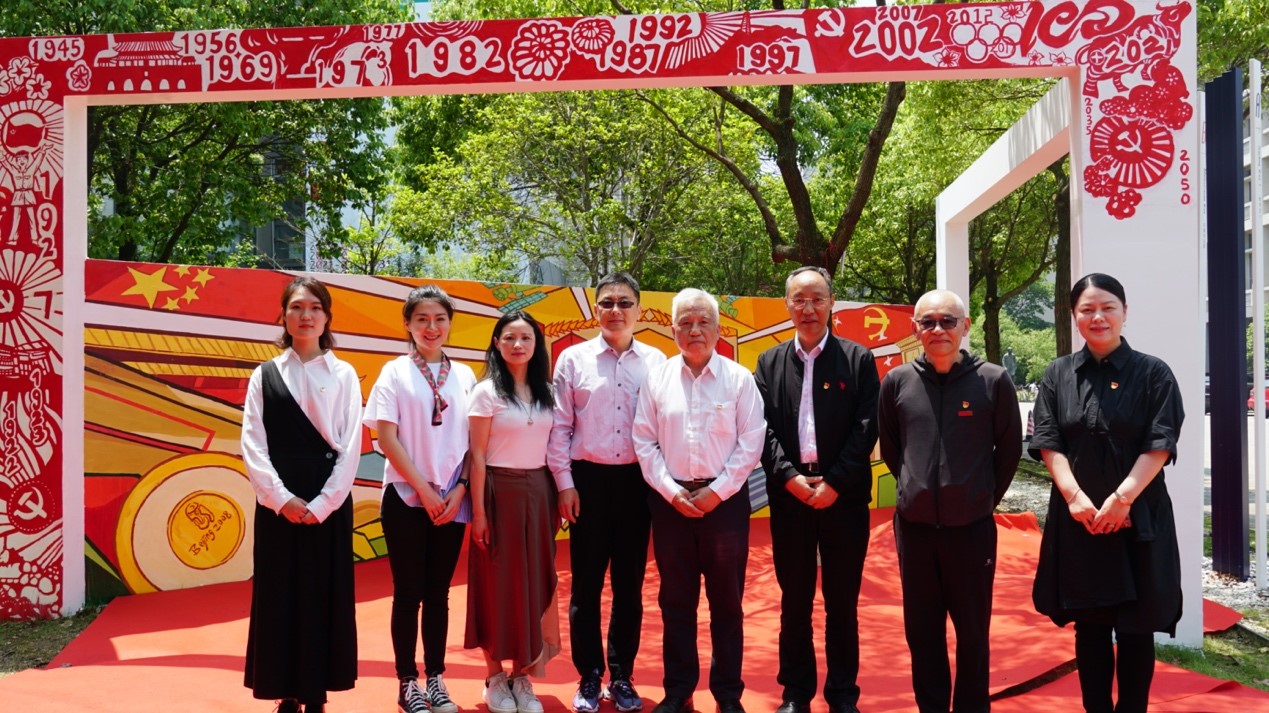 “永远跟党走——师生同绘百年红墙”揭幕仪式在学院“百年红墙”广场举行,校党委常委、组织部部长张影陆,校党委常委、党委办公室主任、统战部部长朱飞,无锡博物院党总支书记肖炜,四虎影院