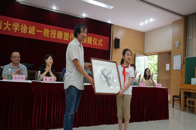 捐赠仪式上,徐诚一教授向云林实验小学捐赠雕塑作品一件及个人著作10余本。其中捐赠的雕塑作品《希望》是徐教授参加全国第九届美术展览获银奖的作品(金奖空缺),也是徐老师第101件作品的捐赠。作品以生动简约的现代雕塑艺术语言和创作手法,塑造了一名山村女童在洪水中,一手紧扶浮木,一手紧抓头顶书包,呼喊求救的感人情景,以此来表现她求生求学的迫切希望,从中生动反映出一个民族未来的希望。为了表达对徐教授的感谢,云小书画社的学生们也向徐教授回赠了自己的作品,将这份沉甸甸的“希望”延续。