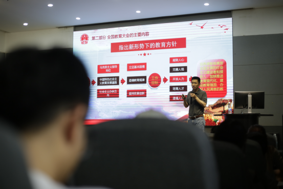 戴月波从最近的热点话题“中美贸易战”切入,引出“不忘初心铸伟业—聚焦全国教育大会宣讲”的主题。他强调,以习近平同志为核心的党中央情系教育事业发展、关注青年人才培养。通过带领同学们回顾改革开放以来党中央、国务院召开的四次全国教育工作会议,戴月波指出每一次全国教育工作会议的召开都是在深入研究当时教育工作面临的形势和任务的前提下对当前和今后一个时期教育改革发展作出的战略部署。随后,他结合2018年全国教育大会,从一个根本任务,一个重要目标,九个坚持,六个下功夫等方面诠释了新时代人才培养体系的新要求、新方向。在谈到深化教育体制改革的问题时,戴月波表示高校不仅要从健全立德树人方面落实机制,扭转不科学的教育评价导向,更要坚决克服唯分数、唯升学、唯文凭、唯论文、唯帽子的“五唯”顽瘴痼疾,从根本上解决教育评价指挥棒问题。在谈到四虎影院