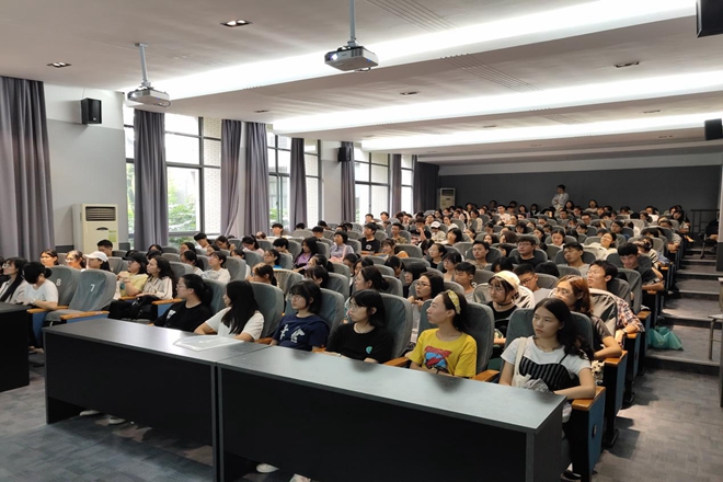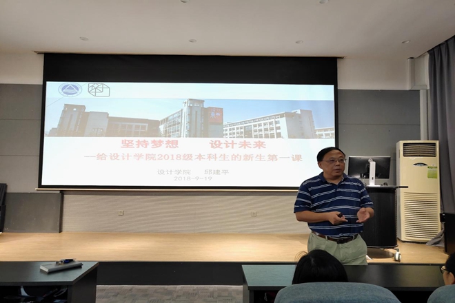 18级本科生新生思政第一课于学院报告厅举行,学院党委书记邱建平以“坚持梦想·设计未来”为主题,与来自环境艺术、产品设计、公共艺术专业等两百余名新生进行分享交流。